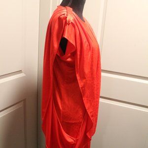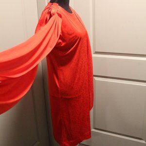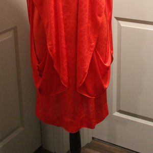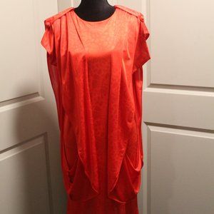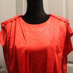 I love this style! The material is a light polyester blend (no tags on the dress) and could be see-through in certain lighting. The material has a pattern that looks like a mixture between leopard print and palm leaves (?) - I think it fits like a Medium but I am more than happy to get specific measurements for you! She is ready for the party :) Happy to answer any questions!