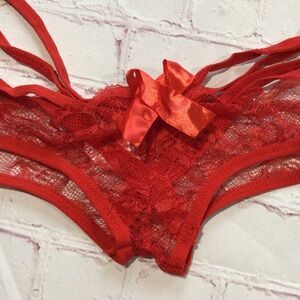 Sexy red strappy lace bra and panty lingerie set. Size Small. This super sexy set is accented with sateen bows on both the bra and panty. The bra has a strap around the back of the neck which is not adjustable. The bra ties in the back. Made of a polyester blend. Hand wash recommended with line dry. New in package. Smoke free home.