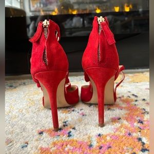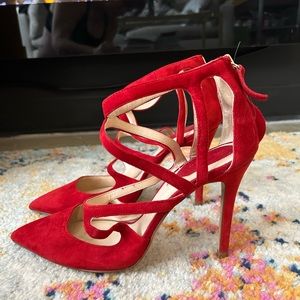 Perfect for date night! These pumps are in great condition and from a smoke free home. EU size 40 which is a 9 in US. Beautiful ruby colored suede leather with caged design. Stiletto height is about 4".