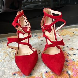 ๐๐๐๐ Sexy Red Suede Strappy Cage Heels Closed Pointed Toe Size 9, 4โ heel