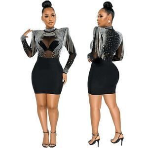 Women's Sexy Rhinestone Embellished Luxurious Nightclub Bodycon Party Shiny Long Sleeve Mini Black & Silver Dress SIZE S NEW