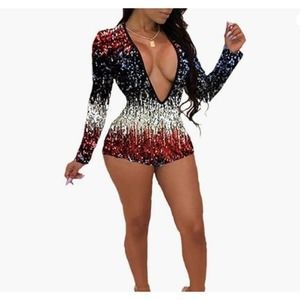Womens Sparkly Sequin One Piece Outfits Sexy Deep V Neck Colorful Short Pants Romper Jumpsuit Playsuit SIZE SMALL