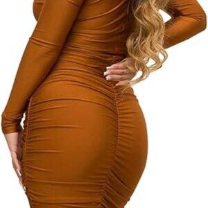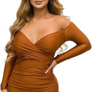 This Rodawu brown ruched bodycon dress features a deep V off-shoulder neckline, long sleeves, and a flattering curve-hugging fit. Perfect for parties, date nights, or clubwear. Lightweight, stretchy, and stylish for a confident, sexy look. Size XXL.