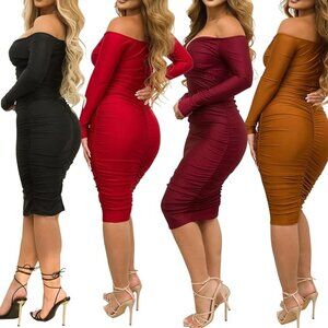 Sexy Ruched Bodycon Midi Dress Off Shoulder Long Sleeve Fall Wedding Guest