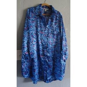The Sexy Sensual Cacique by Lane Bryant Nightgown for Women in size 18/20 is a beautiful blue floral chemise made of lightweight satin polyester material. 23.5 inch of Armp To Armp and 36 inch Long measurement This button-down sleepwear features a V-neckline, long sleeves, and is machine washable for easy care. The plus-size garment by Cacique is accented with a preppy touch, perfect for a colorful and classic nightwear look. Ideal for wearing in the summer, fall, or spring, this nightgown offers both comfort and style for a sensual bedtime experience.