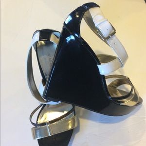 In very good condition. Colors are black, white and gold. Heel measures 5 1/2 inches