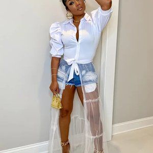Sexy Short Sleeve Turn Down Collar Tie Mesh Dress