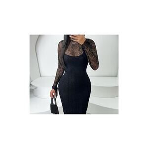Sexy Slim Fit 2 Piece Black See-through Lace Long Sleeved Dress for Women. L