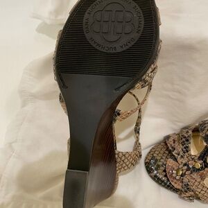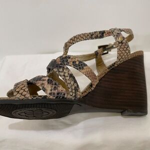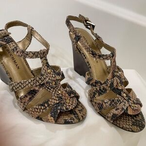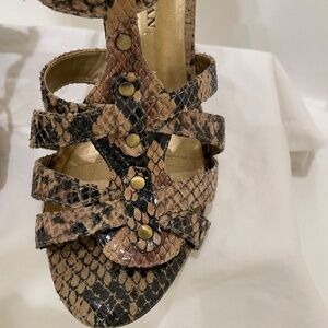 Dana Buchman Snake Skin Wedge Heels - Beautiful and Sexy, Brown, Tan with Gold Studs as accent. Size 6M, Leather Upper, Never Worn, 3 1/2 in wedge heel, Gold buckle at ankle with elastic for stretch.