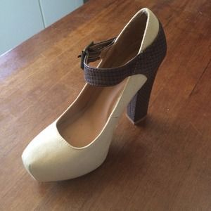 Canvas beige and snakeskin brown detail on the heel & ankle strap. 1" platform with 4.75" heel. Worn once - great condition.