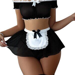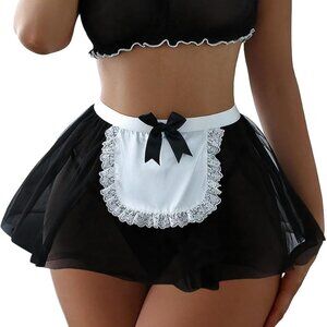 Sexy Stockings Mini Skirt Mesh Sheer Lace Costume Outfit Lingerie with Thong Set