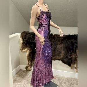 Sparkle and shimmer for your special event with this gorgeous formal gown featuring elegant allover sequins. Open back with cross spaghetti straps.