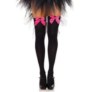 Add a touch of whimsy to your wardrobe with these enchanting black thigh-high stockings, adorned with sweet satin pink bows.