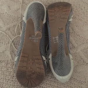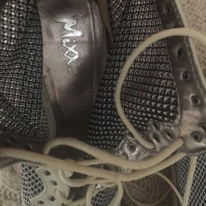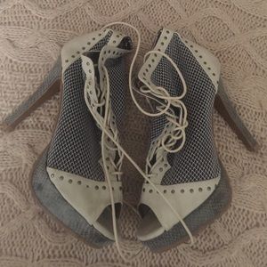Very sexy mesh insert studded heel. These shoes are extremely comfortable. Heel is 5", platform is 1".