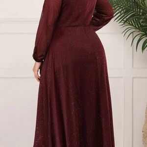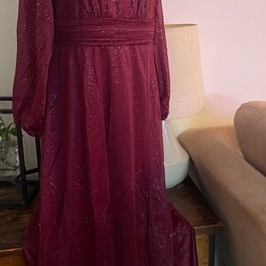 Beautiful floor length Burgandy shimmering evening dress with chiffon sleeves.