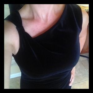 Fitted velvet dress. Asymmetrical neckline with & ruched on Lft side. Slight asymmetrical hem. Pull-on over-head. Lined. Fabric is stretchy.