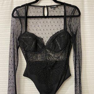 Black lace and mesh "don't wanna wait" bodysuit from Fashion Nova, sold out online as of posting date. Thong bottom, snap button closure. Never worn.
