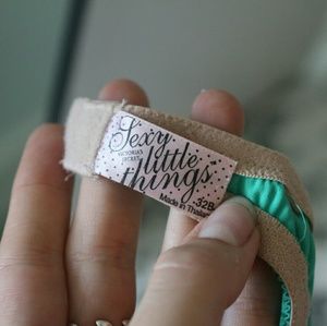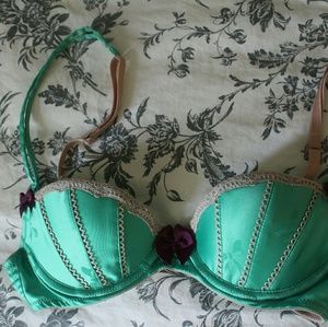 It is a silky green bra with purple and cream ribbons and lacing. It has been worn only a handful of time.