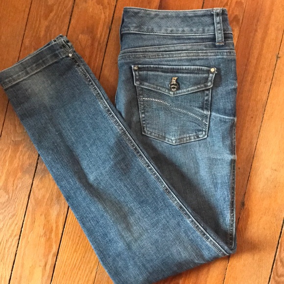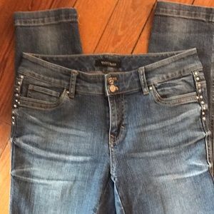 Super sexy jeans by White House Black Market. Rhinestone detailing. Skinny leg. Front and back pockets. Very soft. Good condition. Size 4.