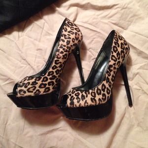 Animal print hair like top with black patent leather heel. Heel 5 inches.