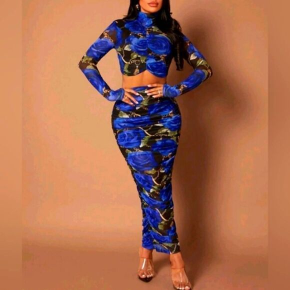 SXY Floral Print Mock Neck Crop Top & Pencil Skirt hugs the body just right.
