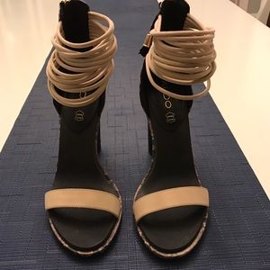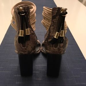 BRAND NEW Super sexy strappy snake print sandals in nude and black with tassel detail on zipper.
