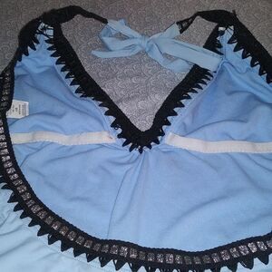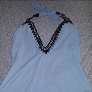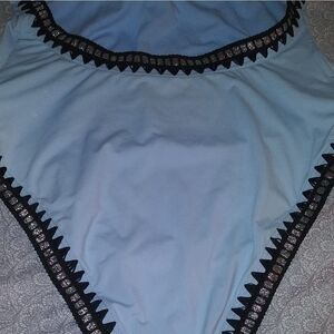 Pale blue bathing suit with jet black and silver stitching as the trim. and also somesilver accent is a classy bathing suit.