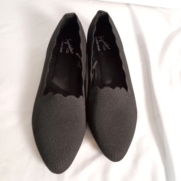 Step into comfort and chic style with these Seychelles Black Ballet Flats in women’s size 10. These flats feature a pointed toe, scalloped edge, and knit-like upper for a sophisticated, feminine look. Designed with a memory foam insole, they provide all-day cushioning and comfort. These shoes are brand new without box, perfect for work, casual outings, or stylish everyday wear.