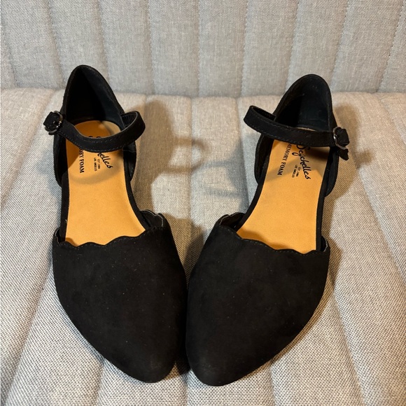 Seychelles memory foam black suede flats with a 1 in heel. scalloped edges size 5.5. Does have two scuff marks on the left heel (see last two photos)