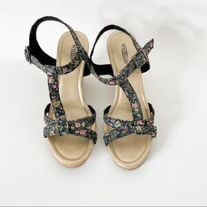 Seychelles black floral fabric upper. Cork platform wedge. Adjustable strap buckle closure.