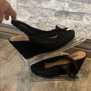Black suede leather sling back wedges with bow detail. Heel is 3 3/4 in