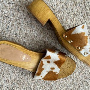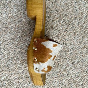 Cute Seychelles cow print mules. Wooden sole. Great condition, only wore a couple of times because they are too large on me.