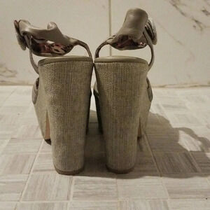 Please note.. While these are brand new, the fabric on the heels is lifting in a few areas. See expample in higlighted last picture