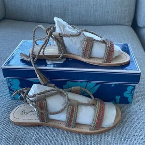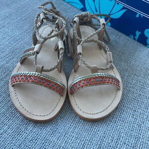 Intricately ornate boho style sandal with braided, wrap-around ankle straps and tassel detail