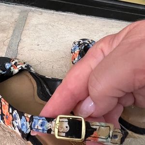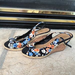 EUC Adorable open toe floral fabric shoe with platform heel, hardly worn, great condition, comfy and CUTE!!! Dark navy background with lighter blue, cream, beige coral and orange make these a neutral and so easy to wear with so many options! Cork heel with jute cord detail. beach, picnic, boat, party, office, casual, summer, spring, platform