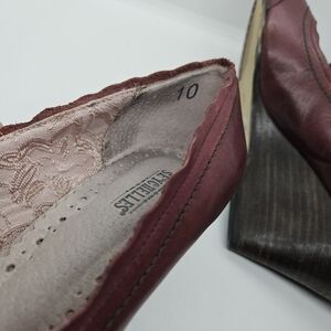 Leather wedges in a dark red or maroon color. Has scalloped edges. Padded insoles for added comfort. Wedge measures approximately 3"