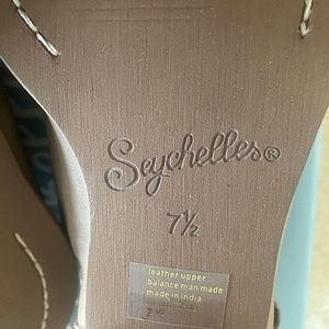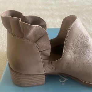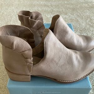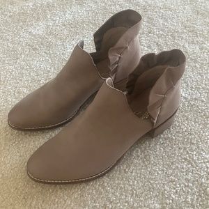 This listing is for a pair of Seychelles Renowned Nubuck Booties in the color of Taupe in a size 37.5 They have been worn once but were too large for me. The distressed well worn in look counters the girl ruffle that surrounds the ankle. An almond toe gives a timeless look to a very comfortable boot provided by the 1 inch stacked wooden heel. Plenty to love here!