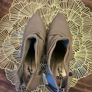 Chic wedge booties with cutout design. Neutral taupe color goes with anything. Convenient back zips. Stylish and comfortable for any outing.