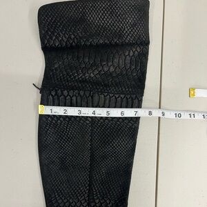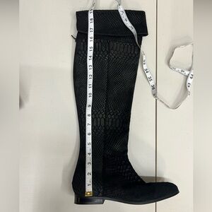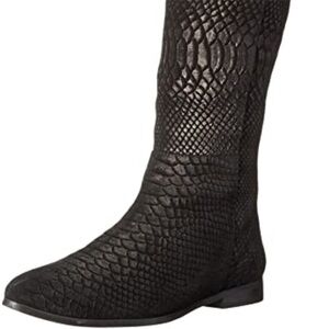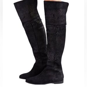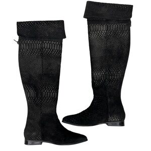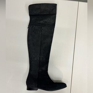 Seychelles Victory Croc Embossed Suede Leather Over the Knee or Knee High Boots Size 6. These boots are gorgeous! The color is hard to explain. It looks different in different lighting. I think it is considered black, but it's more of a deep charcoal or a very deep chocolate brown in some lighting. They are an embossed suede and can be worn as either knee high or over the knee. They are a pull on style featuring a comfortable almond shaped toe. These boots are in very good pre-owned condition with minimal signs of wear. Please see photos for details and approximate measurements and feel free to ask questions!
