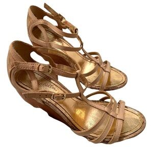 Good condition, some wear as shown. Seychelles. Wedges. Strappy. Ankle straps with 2 buckle closure. Beige with gold geo detail on back. Leather. Wooden Heel. size 7.5. Smoke free home. No trades, offers welcome.