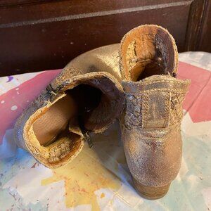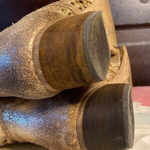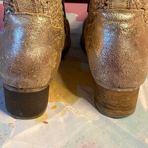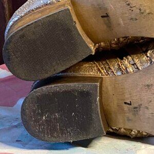 Shine on, cowgirl ✨ These Seychelles metallic gold leather booties feature chic western-inspired cutouts, low 1.5” block heels, and easy side zip closures. A perfect blend of glam and rustic charm—great for festivals, holiday parties, or everyday style with jeans and skirts. Pre-loved with minor interior right heel wear (see photos). Size 7, genuine leather.