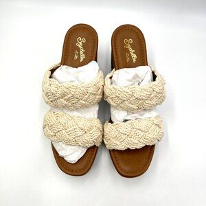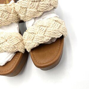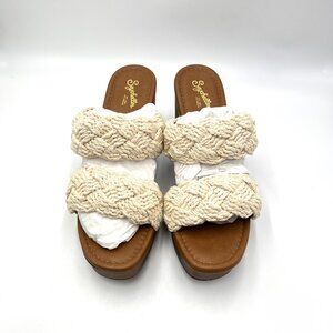 Seychelles women's Smoke Show two band woven cream macrame slip on platform heels.