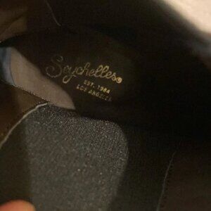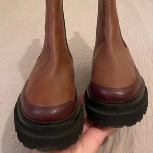 Seychelles Los Angeles brown boots. Pull-on style with elastic side panel. Two-tone brown leather.