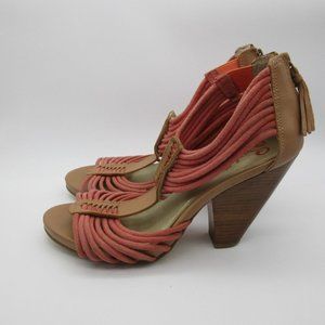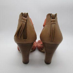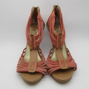 Cute summer sandals with a bright tan and coral color scheme.