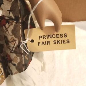 this is a 14" porcelain Native American doll from the Seymour Mann collection of fine dolls. her Native American name is Princess Fair Skies. absolutely stunning from her braided hair her necklace and down to her sandals.