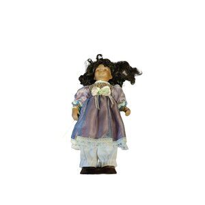 The doll is porcelain made and comes without packaging. It is a realistic and lifelike piece, perfect for all occasions. The set includes three pieces and is handmade in China. The doll is a girl doll and is part of the African American ethnicity. It is a perfect addition to any collection, and a must-have for Seymour Mann fans.
