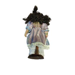 This Seymour Mann Connoisseur Porcelain Collection African American Doll with Stand is a collector's dream come true. The doll features dark brown curly hair, medium dark complexion, and brown eyes. It is a single unit doll from the vintage 1996 collection, and is an original piece. The doll is part of the Seymour Mann Dolls brand and the Connoisseur Collection series.
