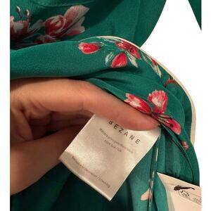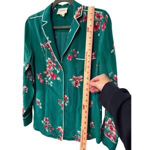 Sezane 4 Elisa 100% Silk Pajama Blouse Floral White Piping Covered Buttons Green