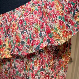 Gorgeous shimmery one shoulder top from SEZANE in a bright floral print with gold metalic threads woven throughout. Material is a silk blend of 85% silk and 15% metallic fibers.