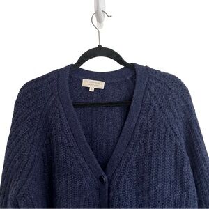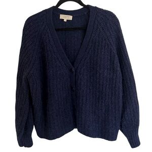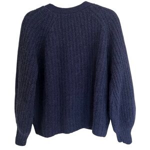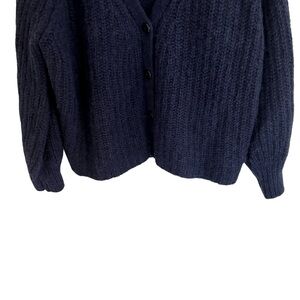 Navy blue, alpaca wool blend, v neck cardigan with long slightly puffed sleeves. Slightly oversized. Preowned but in great condition.